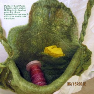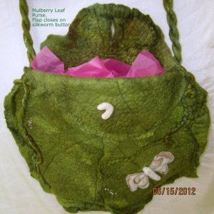 UPDATE Nov. 2023. My..my.. how the decade has flown past! Over these wonderful years of fiber festivals…. and Aurora Colony Handspinners Guild meetings… I’ve learned so much. Toss in online tutorials… and blogs…and endless conversations with other artists. I’ve learned SO MUCH. I say this because I love the idea of this big ol’ Mulberry Leaf purse, but I know better felting techniques nowadays, and really should try making that bag again. This time for myself, since I’d been reluctant to sell it back then. And I’ve got ideas to improve embellishments too.