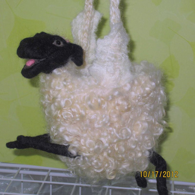 Seraphina ~ an angel sheep (wheel bag). Her lacy wings give her flight and clearly tickle her fancy! She wears pearly Teeswater locks, and her cord is spun from Silk/Merino/sparkle for a twinkly sheen. She sure thinks she’s something special!