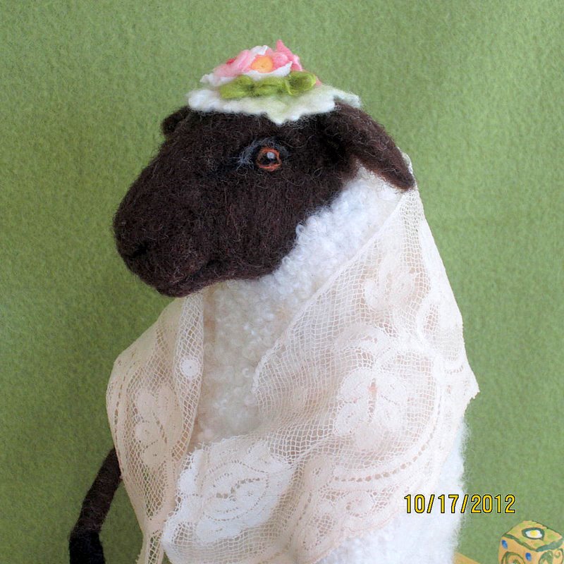 Marigold sheep…. and….an experimental Franken-sheep, in honor of Halloween coming up soon. He’s got patches of felted sweater wool, sprinkled with bits of gray curls. Dangling legs that wobble & swing (strongly attached tho). Patched button eyes & attitude! I call him “Scrappy.”