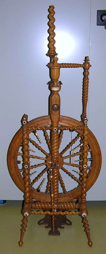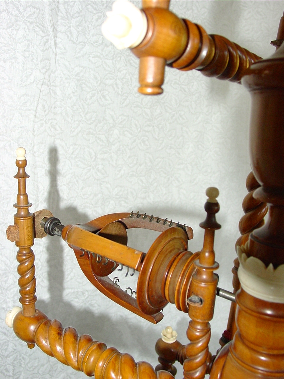 The greatest curiosity is the 3-pronged flyer. Why three arms? Discussion with knowledgeable spinners reaches the same conclusion: we see no advantage. We suspect the maker made the unusual flyer simply because he could. Because it would be unique and more ornate.