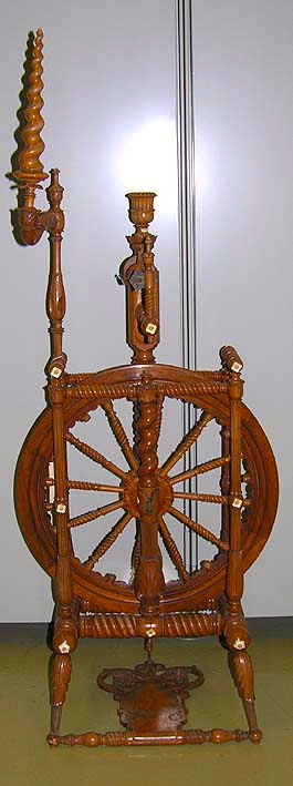 The maker’s initials are all over the wheel. I mean it. Every single stick has the initials “S.E.” embossed in one end. That maker sure was proud…and with good reason. The wheel hub is a petaled flower. The glowing wood is silky smooth, as is the (lacquered?) finish. The barley twist carvings: each perfect. So much ornamentation it truly is a frilly confection of a wheel.