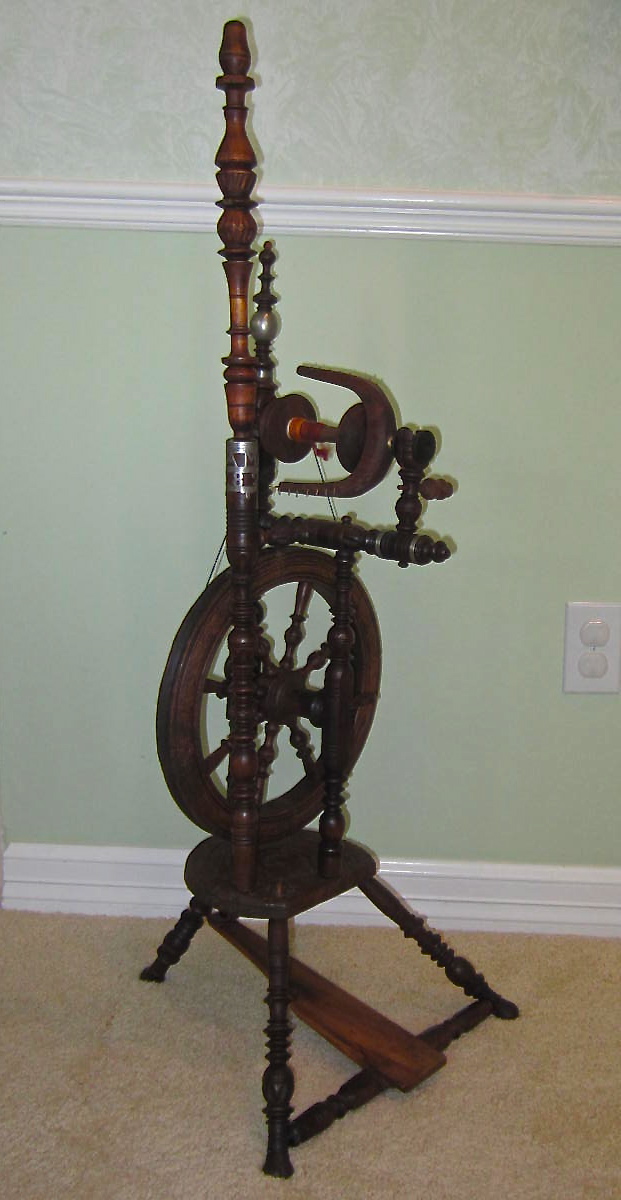 I named her “Anastasia” before I knew the wheel was probably of Finnish origin. The name being that of a Grand Duchess, it seemed to match her elegance. The amount of ornate detail here is amazing! Every stick is a smoothly turned barley twist. I just love the distaff – which reminds me of soft-swirly ice cream. The white carvings are ivory, with black ebony buttons dotting the wheel. The tension knob resembles an acorn, and even the treadle has lacy carving.
