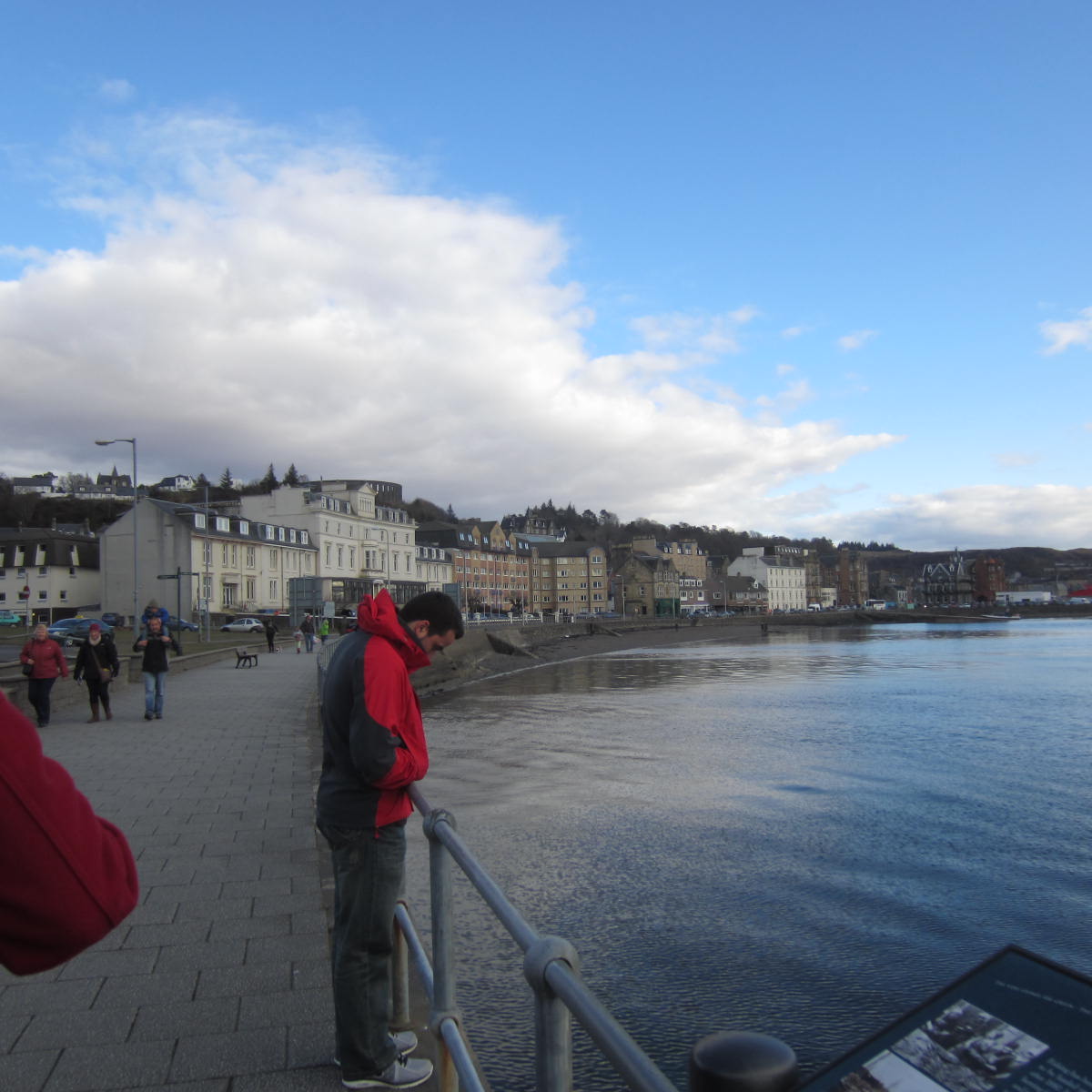 Oban is a busy fishing area, with small ships to & fro all day, except when a WHALE wanders into the sound! While we had been cycling on Kerrera, we missed the rare whale sighting in Oban bay that had the town abuzz. Our ferryman said the larger ships were suspended – to give the whale some peace while it lingered close to shore. Behind the news photo of the whale’s tale, see the buildings at water’s edge? See the red Youth Hostel sign? Yeah, our (wonderful!) Kilchrenan House B&B was just to the left. We just missed see a whale up close and how close would we have been? Bret at waters edge below: THAT close! Argh!