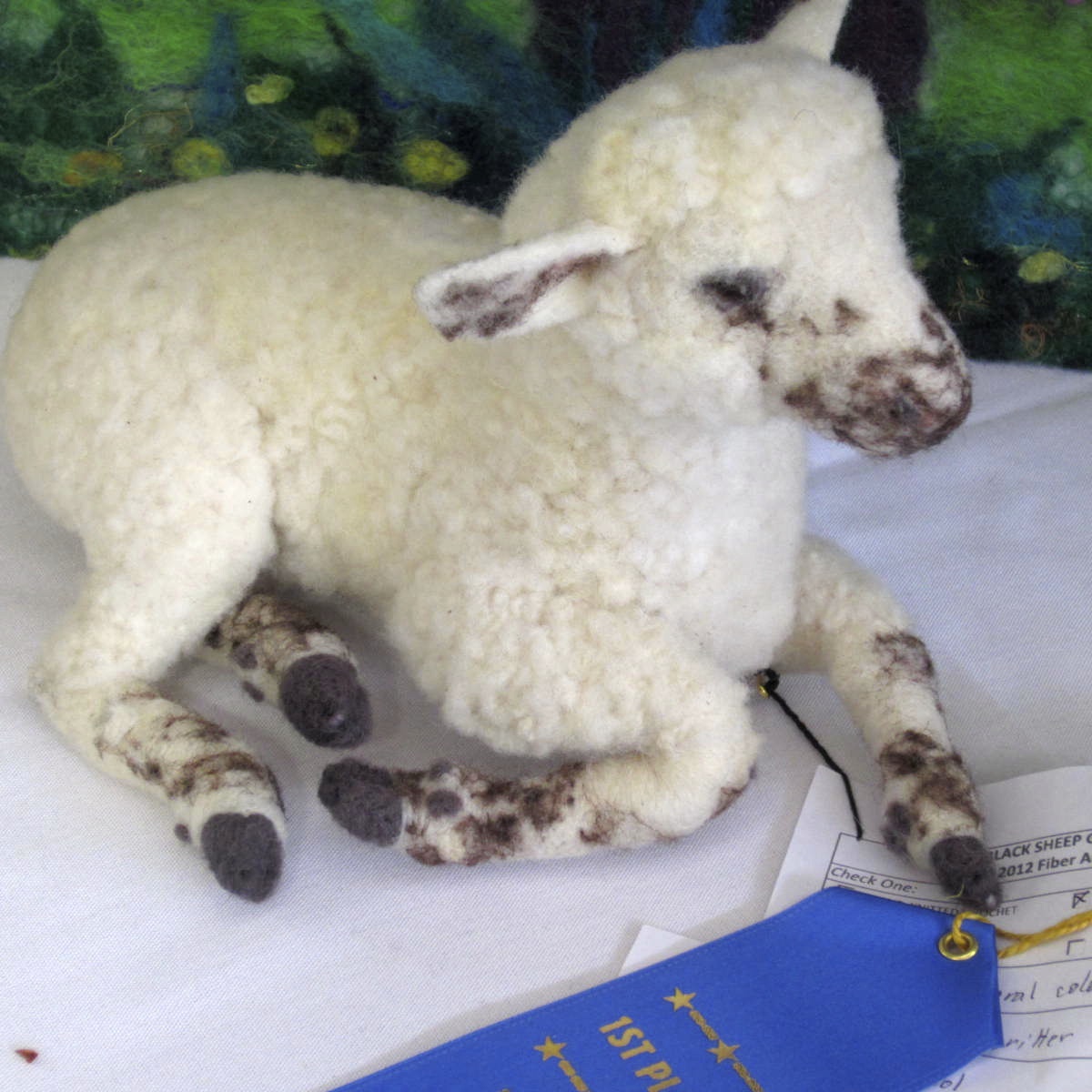 Black Sheep Gathering 2013 was fabulous, though I seldom escaped our busy booth (not complaining!). A collision of serendipitous events made this year’s show particularly memorable: 1). I had dedicated show earnings as wedding gift for our eldest daughter, to be married the following week. 2). Youngest daughter flew over from Scotland for her sisters wedding, & arrived earlier so she could help work our booth (awww). 3). My Fiber Arts Contest entry won “People’s Choice Award” with an avalanche of heart stickers. 4). A delightful woman visiting awhile in our booth inquired whether she could purchase my contest entry: a large needle-felted Gotland Ewe & Lamb. Answer: Yes! Mary later revealed that her stunning knit sweater had won the Black Sheep Cup!