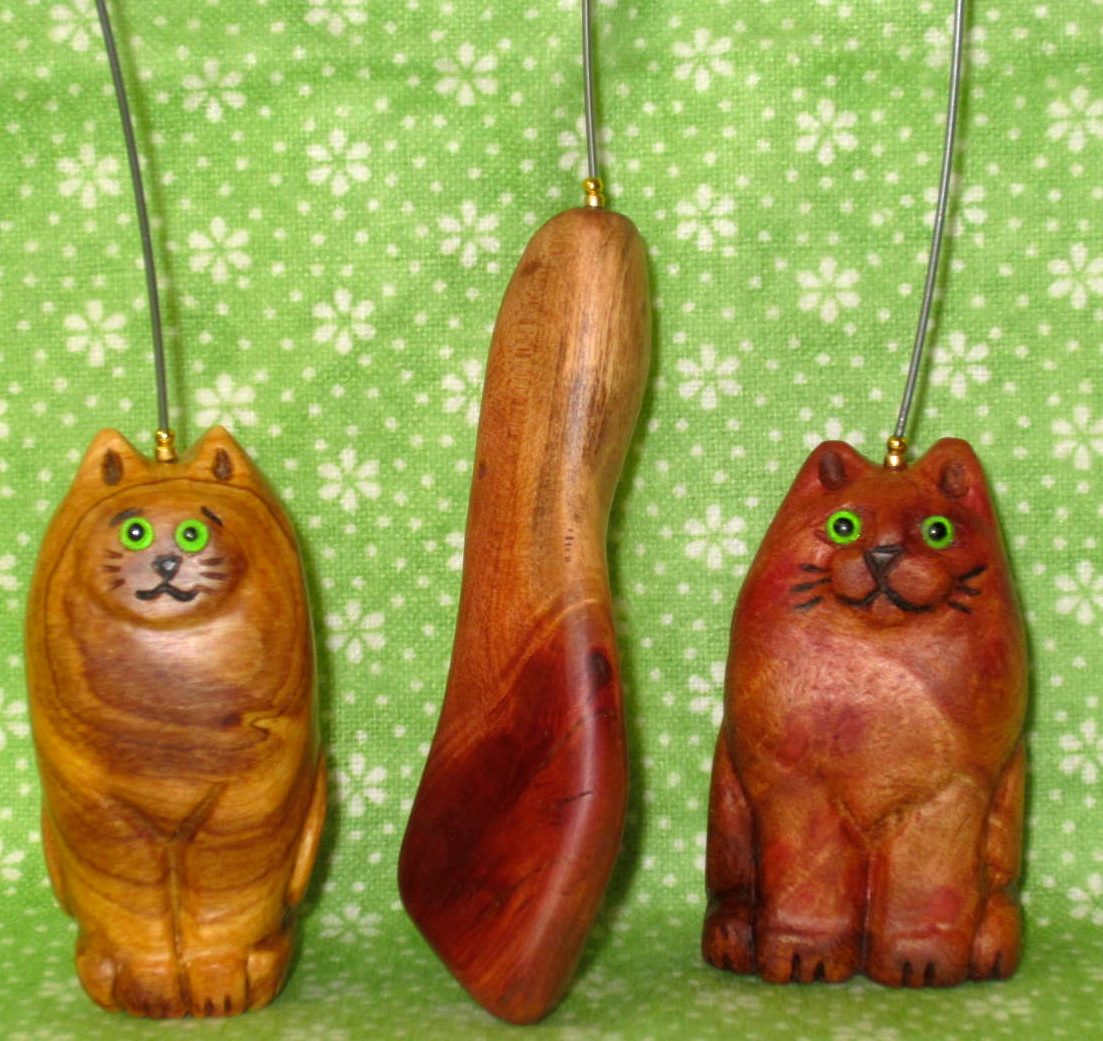 Here Kitty, kitty, kitty…. Hand-carved SPINNING WHEEL HOOKS left to right are made of Camphor burl, Yew, Walnut, + 2 cats in Curly Maple. The tallest cat made of Yew has especially nice wood grain on the back. The cat duo are made of Wild Olive & Camphor burl, with a wedge of Manzanita between them. All the cats have German glass eyes (on a wire) securely imbedded, giving them each a mischievous expression.