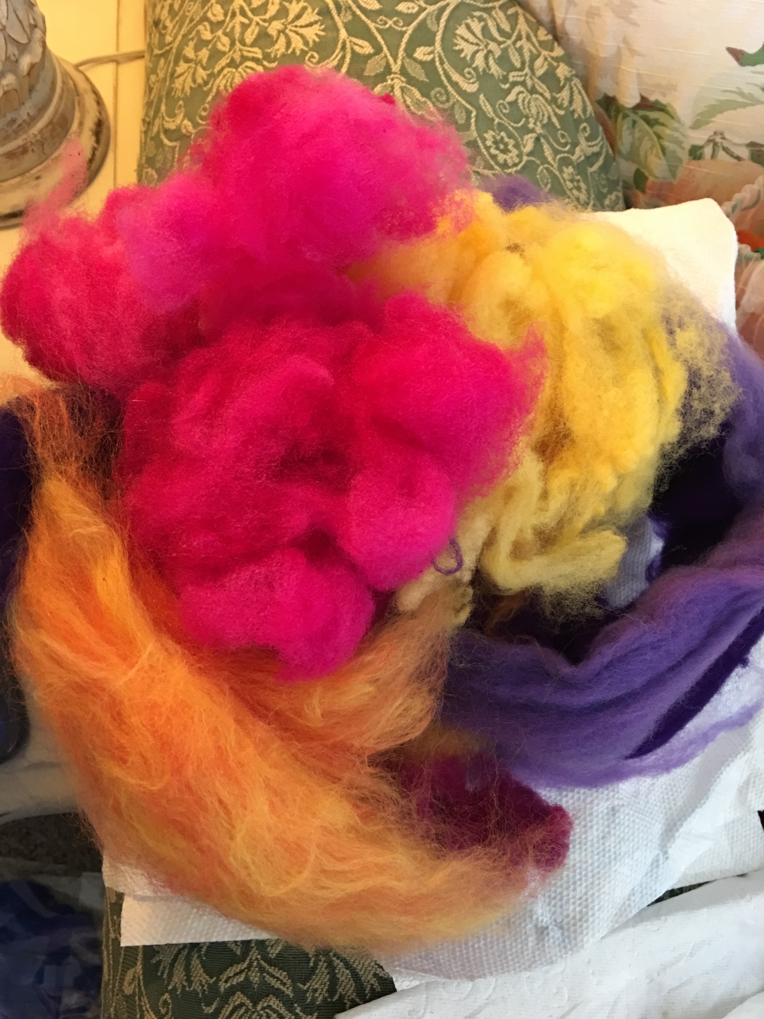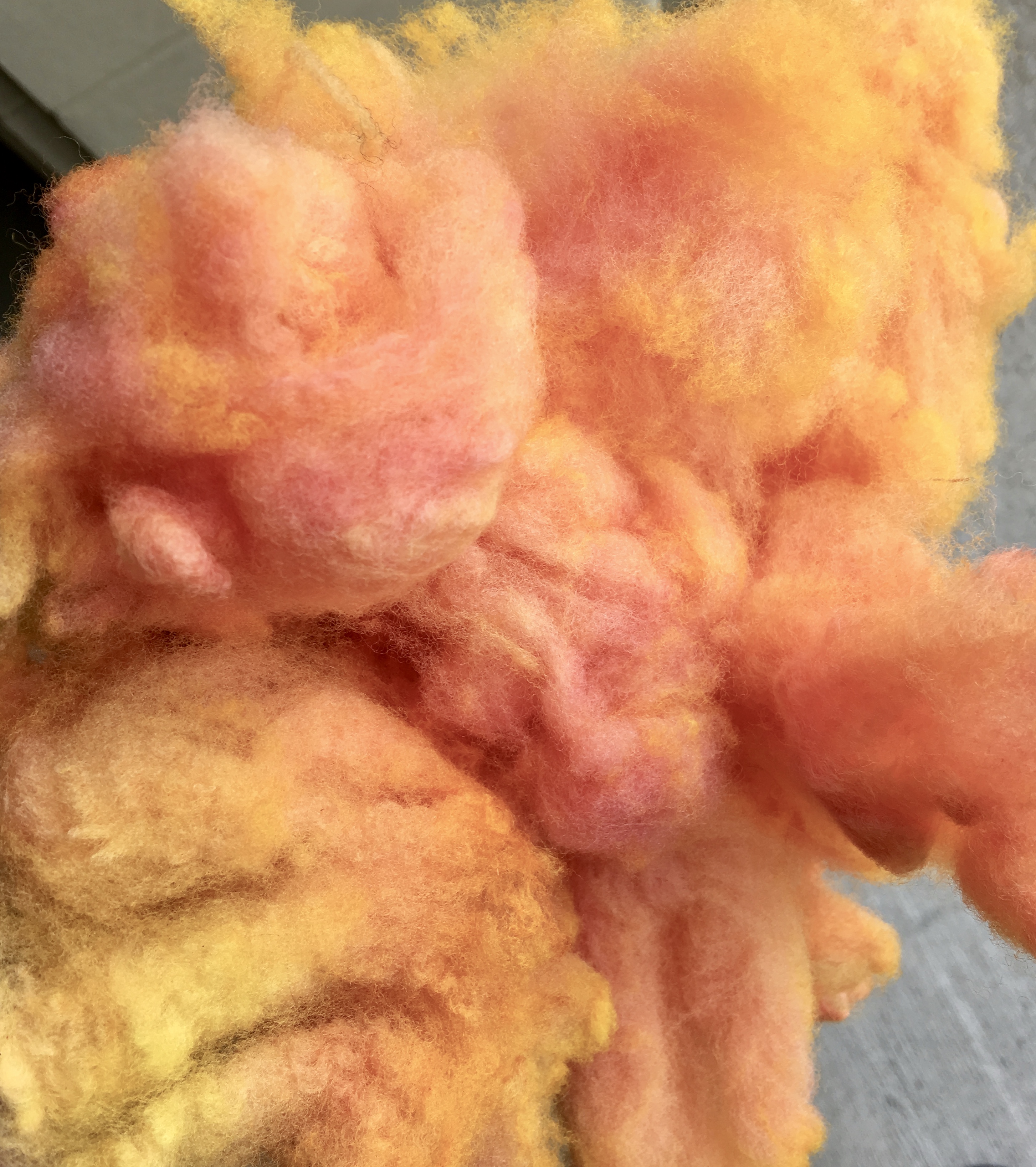 Behold the Rewards of Glorious COLORrrrrrrrr! How I love turning white wool into fluffy clouds of color. Feast your eyes on this mouth-watering handful of tangerine tones, pink blush and lemony yellows. I didn’t know the color could ‘take’ that way, but you’d better believe I recorded details in my huge binder notebook so I’d have a better future chance to replicate this pretty result.