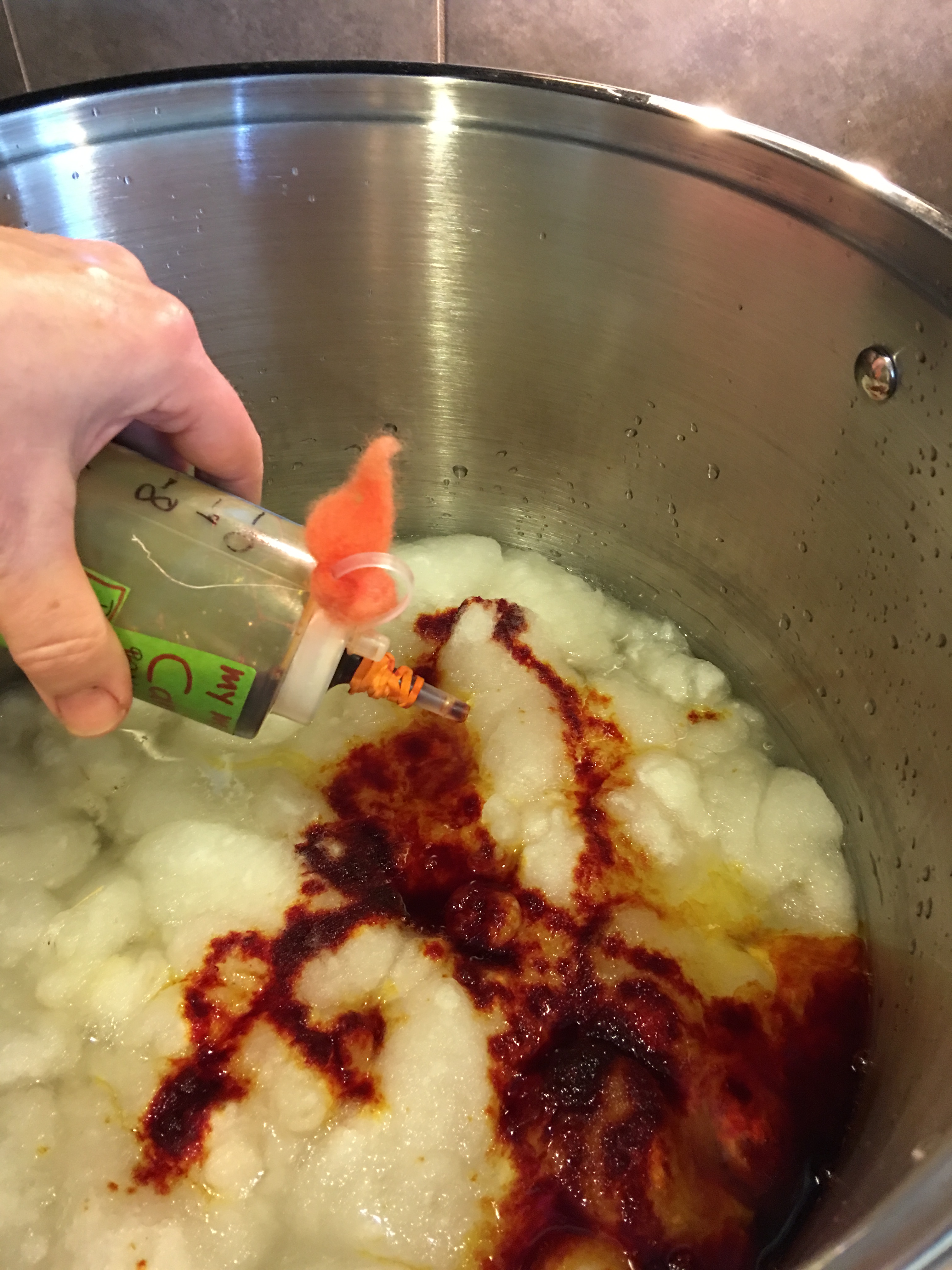 Another good tip: Always dye a small strip of wool and tie onto jar lid. You can see at a glance the actual representation of the color you want to use. I always dye a wee strip of Merino, sometimes silk, or a coarser wool – which – curiously – often take the color different than Merino. Sometimes I show dark & light tones of the same dye color.