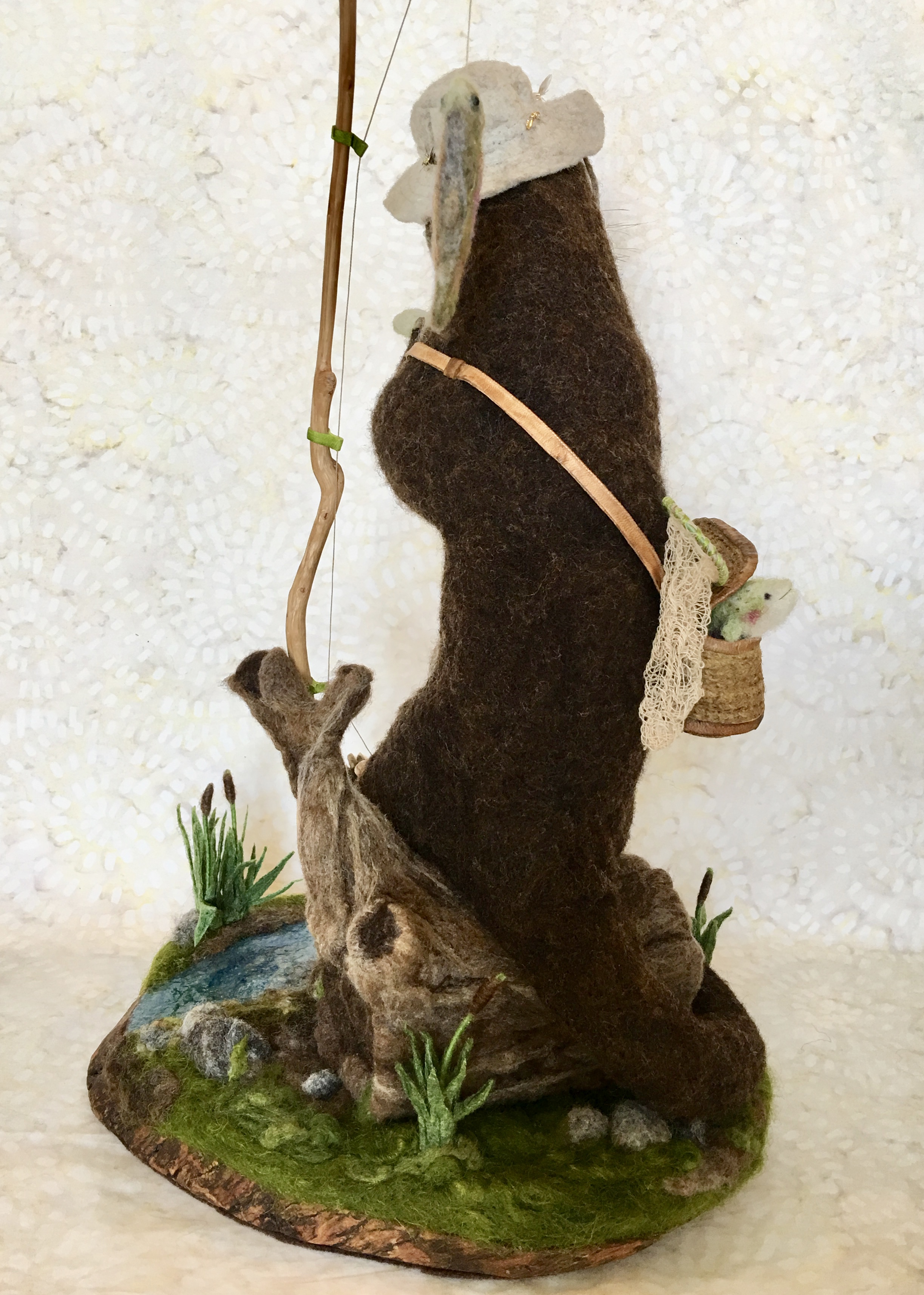 Ollie had been delightfully fun to create, even though it’s a great deal more work to build a larger 16″ tall sculpture – requiring many days of long hours needle felting and attention to the myriad details. But honestly – those details are SUCH fun! I laughed with glee when I figured out how to make my own fish basket.
