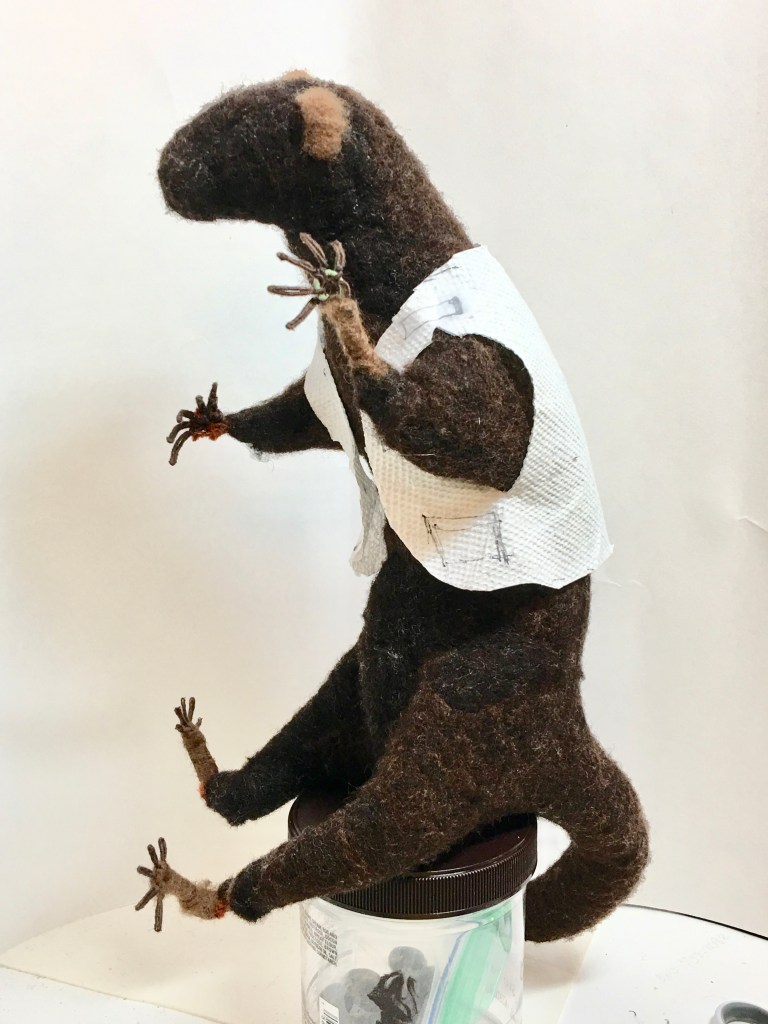 Otter in progress. Black Welsh Mountain crimpy fleece makes up whole body. Fishing vest in paper towel template, but idea rejected. I want to see the shoulder blades, hunched spine and poochy tummy, unobstructed by vest. Move on to next ideas..