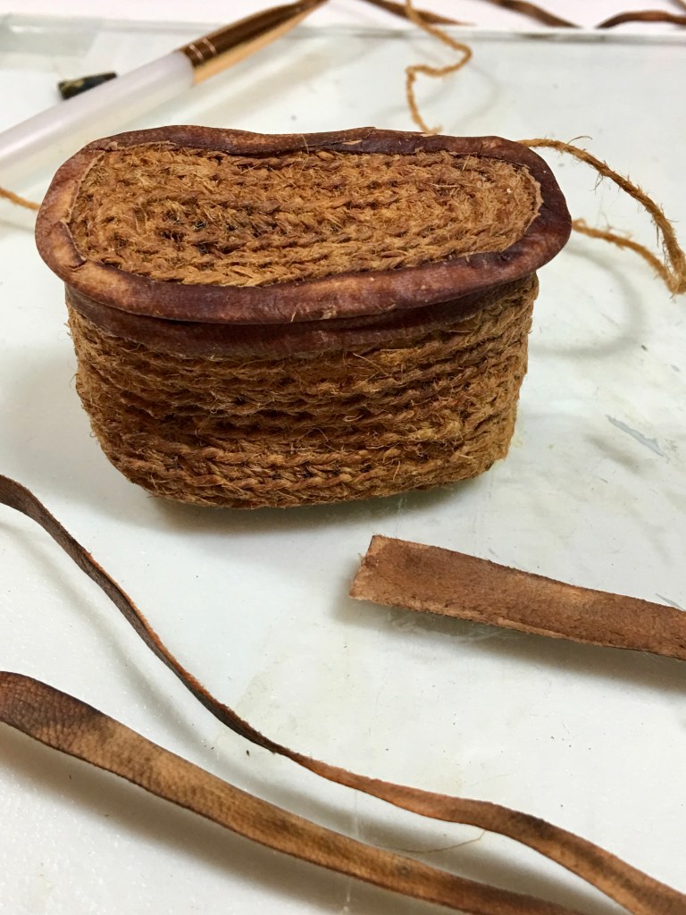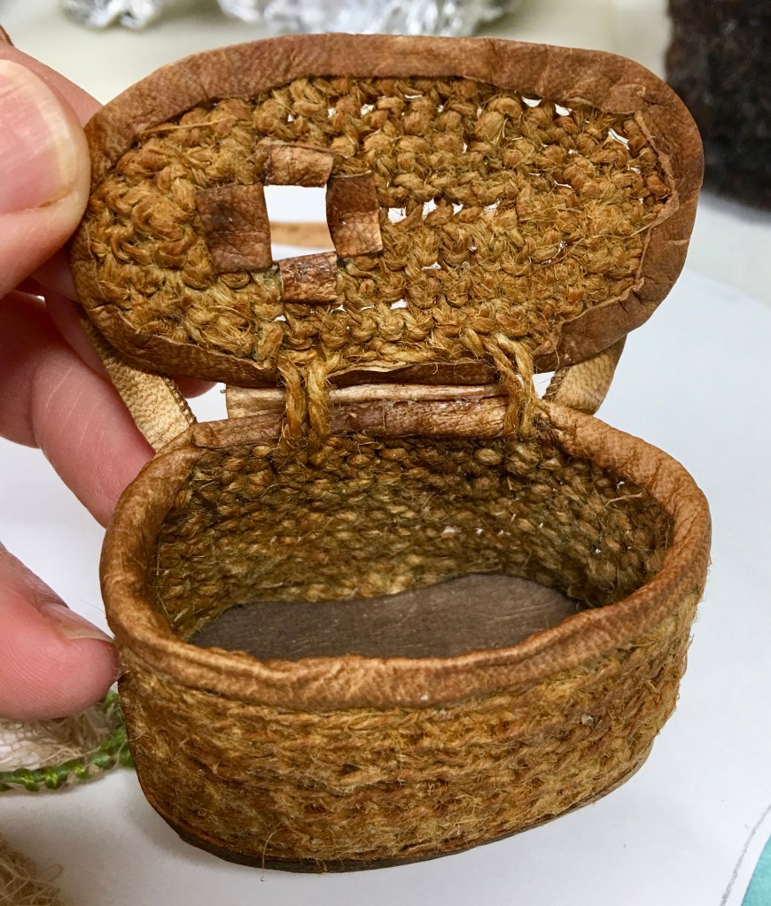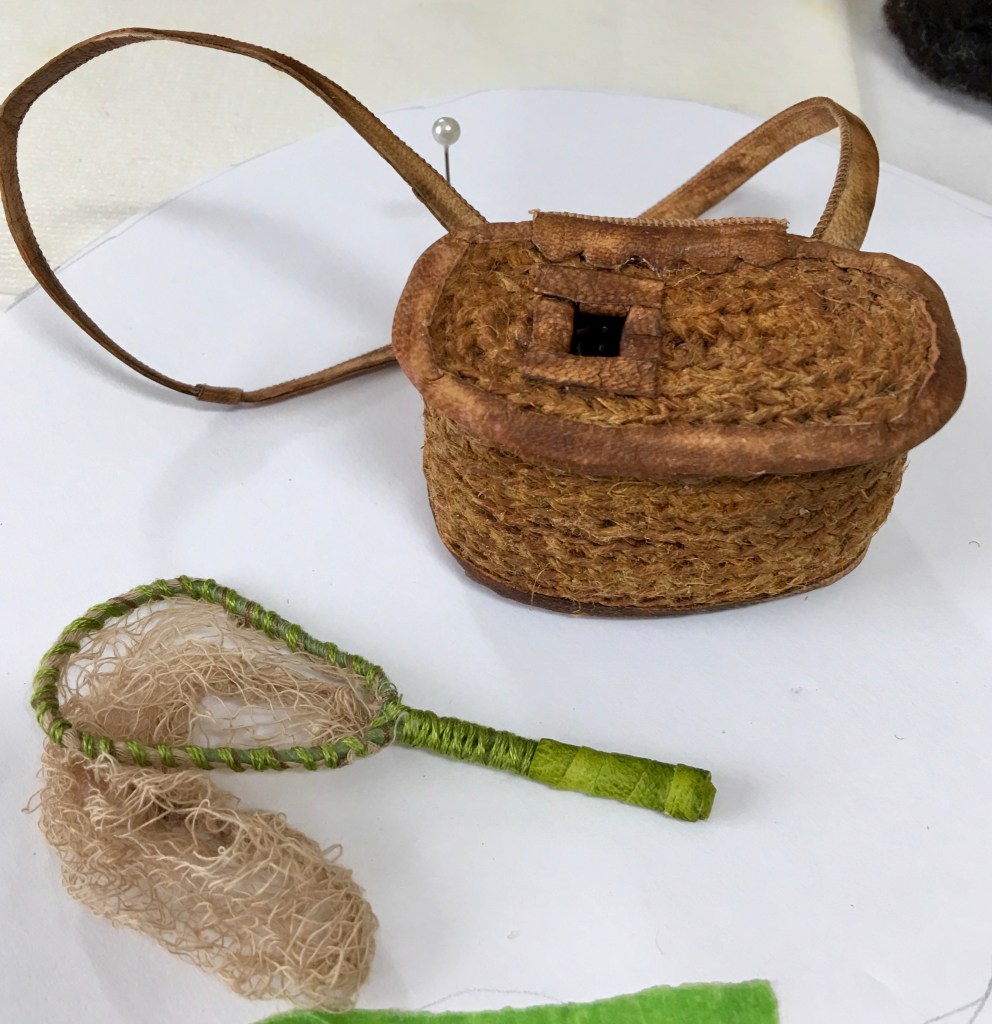 Ollies fishing basket ~ also known as a Creel ~ isn’t made of traditional wicker. I wanted the look but lacked time or inclination to learn basket weaving. Impatient for instant gratification and rapid progress, I stepped up my invention points by managing with materials on hand. Natural Hemp cord to crochet the custom sized basket, and tinted it a bit splotchy for a well worn appearance. Glove leather being thin and flexible made up basket trim and strap, plus net handle. Basket has hinged lid with traditional hole for fishing net. Wool fish have glass eyes.