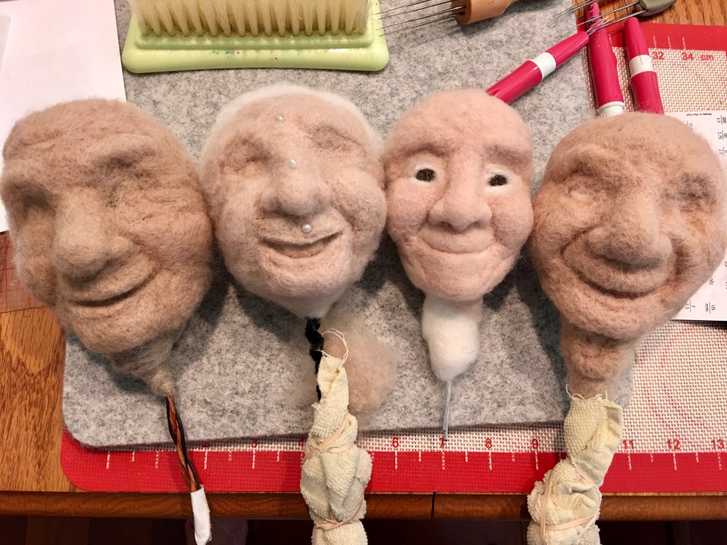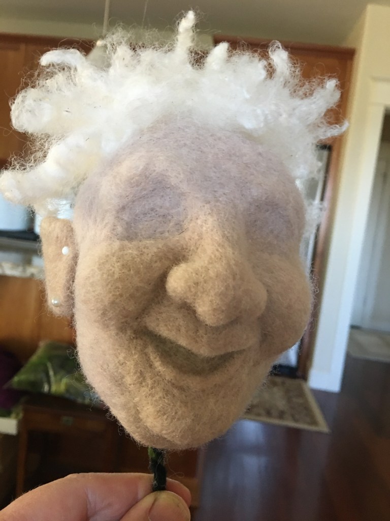 Diving right into practice, I rapidly learned it’s best to work on human heads as if they were woolly lollipops on a wire stick. Initially I tried shaping the head while attached to body, then had to decapitate her because it was too hard rotating the whole body while tackling details of her face.