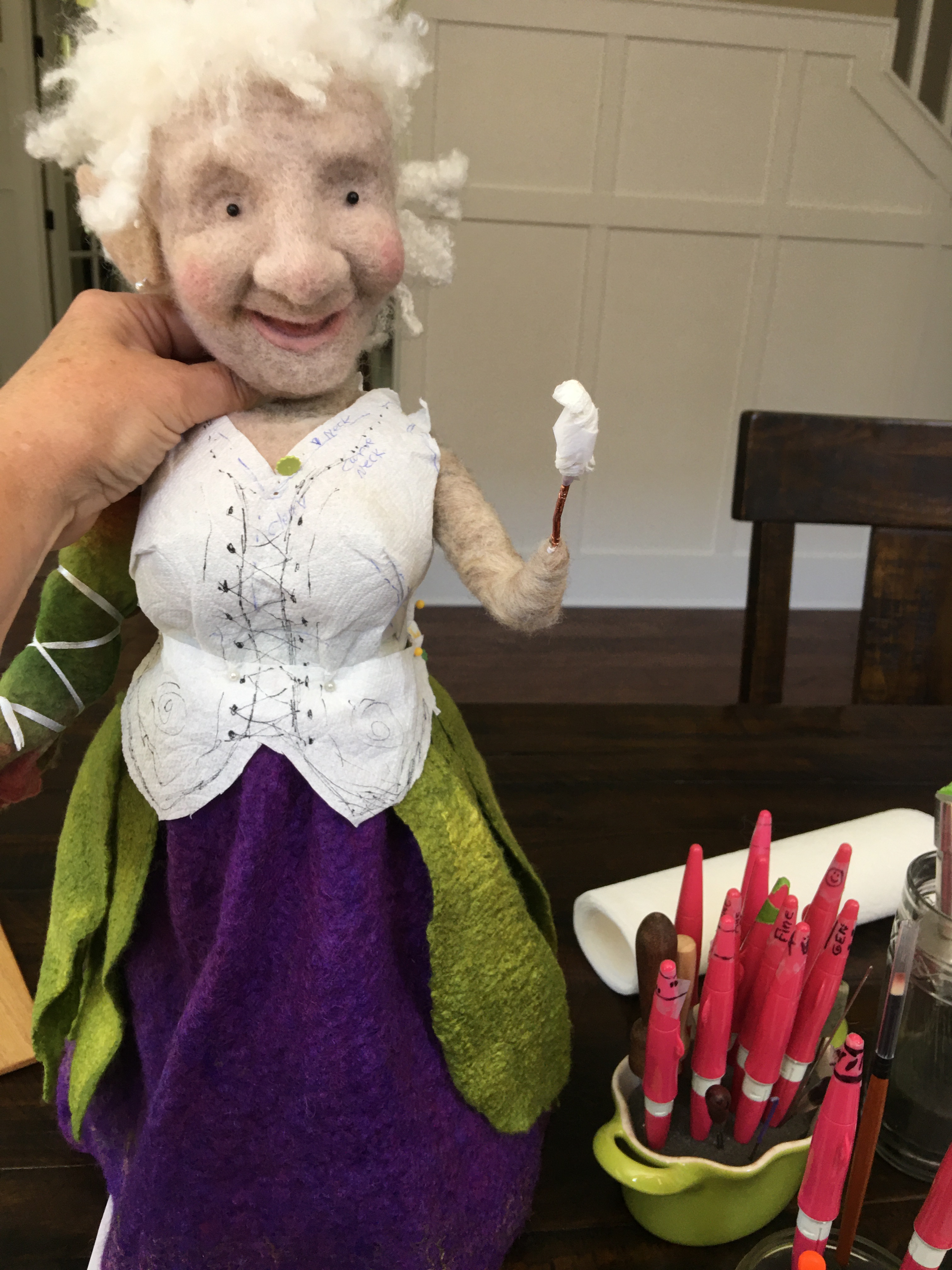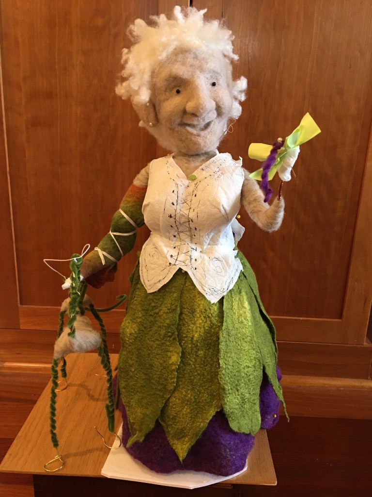 Psyching myself up to try a sculpture with a human FACE, and simultaneously learn to make thin, silk fiber WINGS, it was obvious I’d be making a large fairy person. I wise-cracked to my husband “She can’t be predictably tiny and delicate. Let her be unusual…say, a plump, elderly fairy. I can make that work.”
