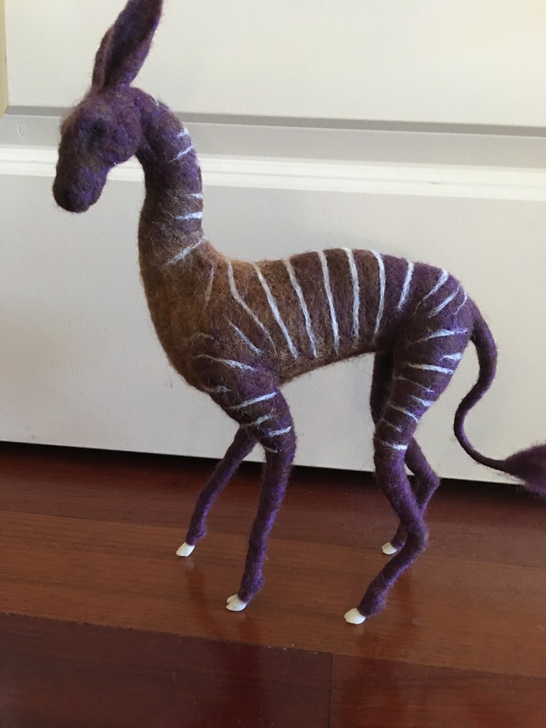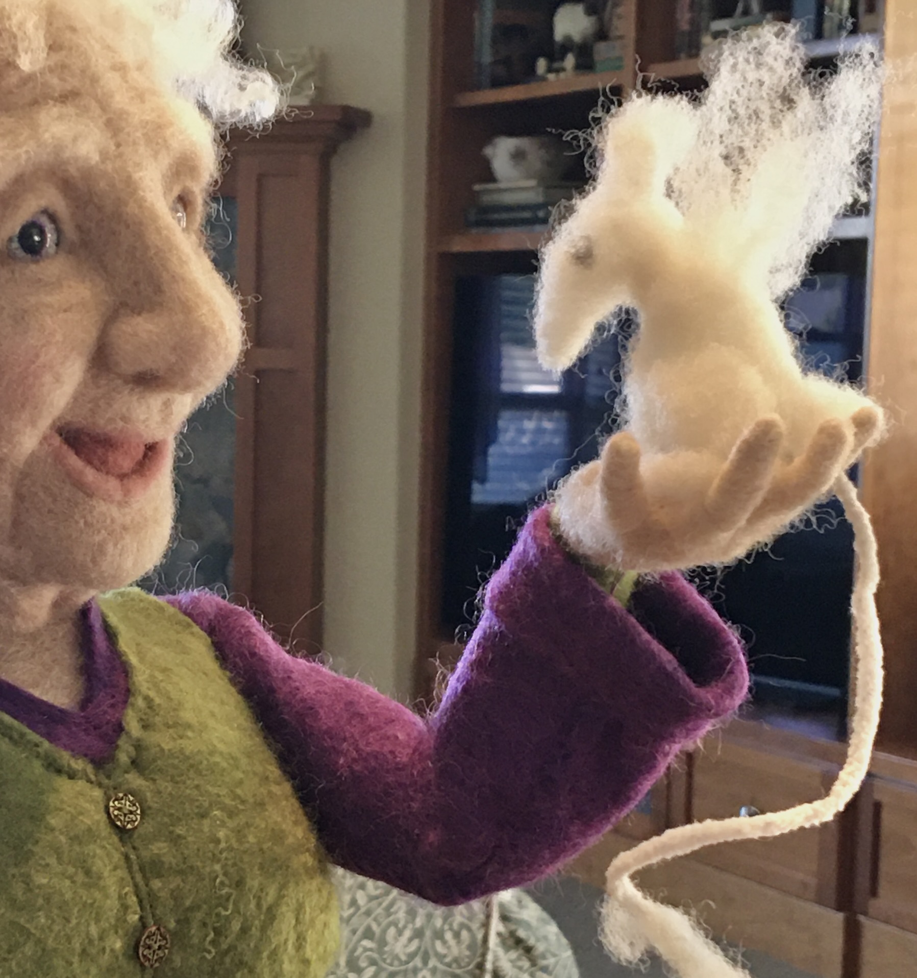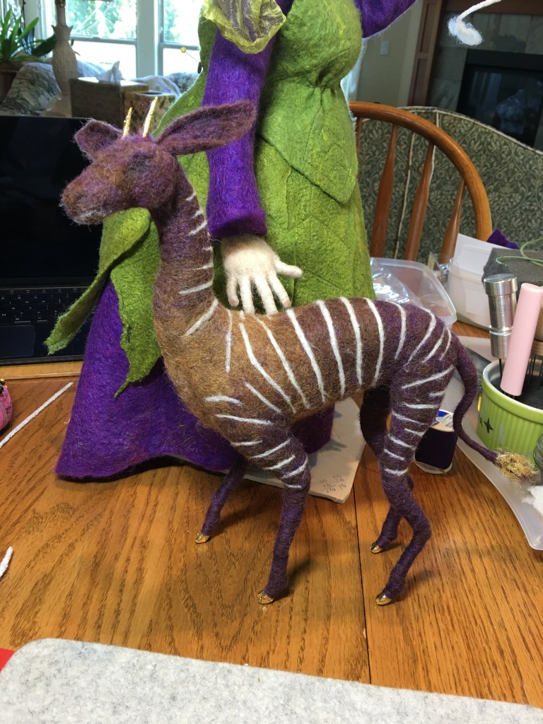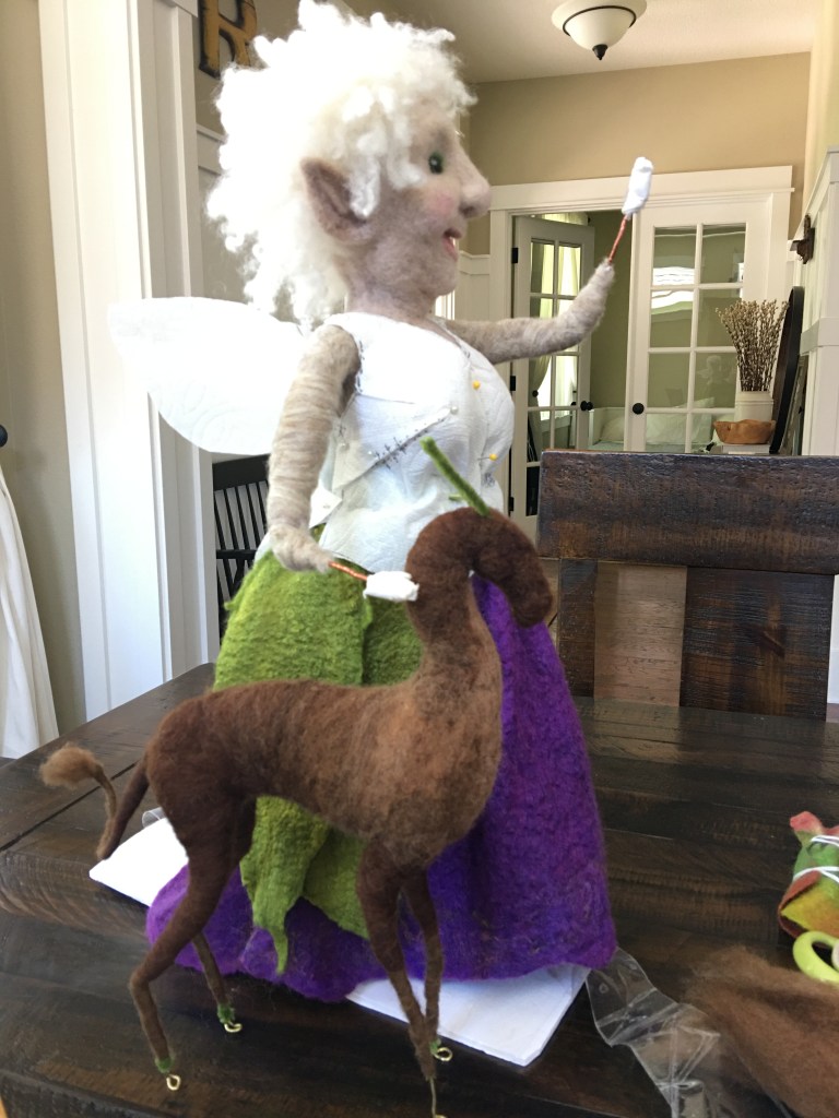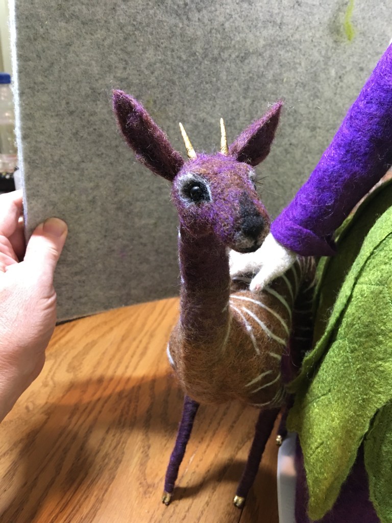 The two creatures above were such fun to make. Explorative creation means you don’t always need a specific plan beyond “this tall deer-like critter needs a RIDER.” What shape? What color? What features? How to position it? Saddle or not? And, where will Maisie’s hand rest? The main point is to move forward. Often, I’ll barely needle-poke wool to form a squishy shape of what I’m imagining – see the white thing in her hand. A mockup quickly informs whether a size & shape will work before investing hours of labor.