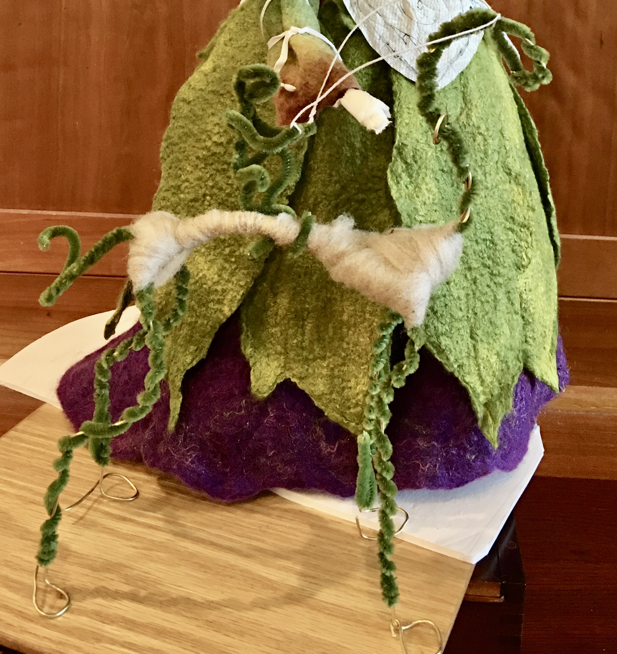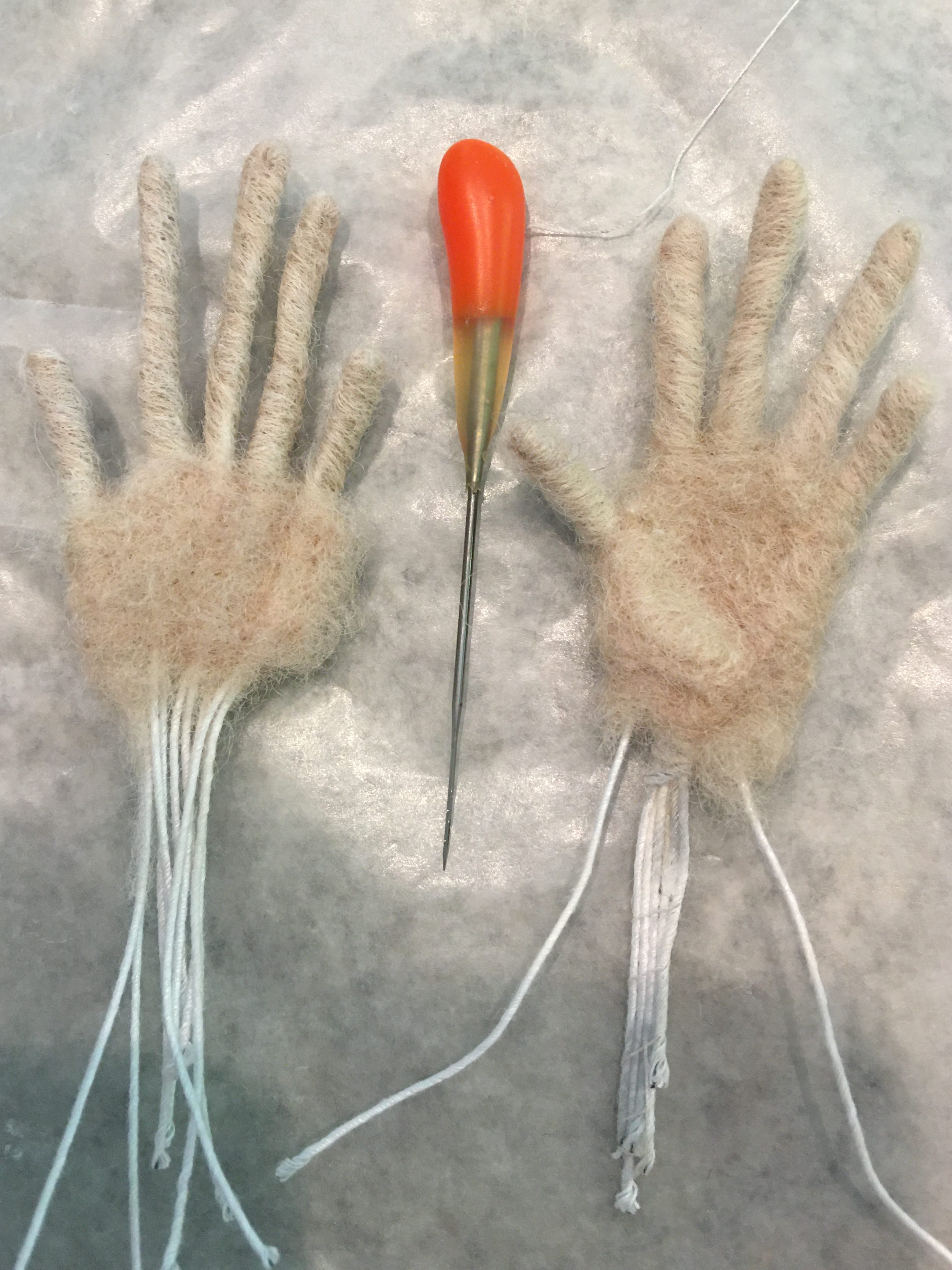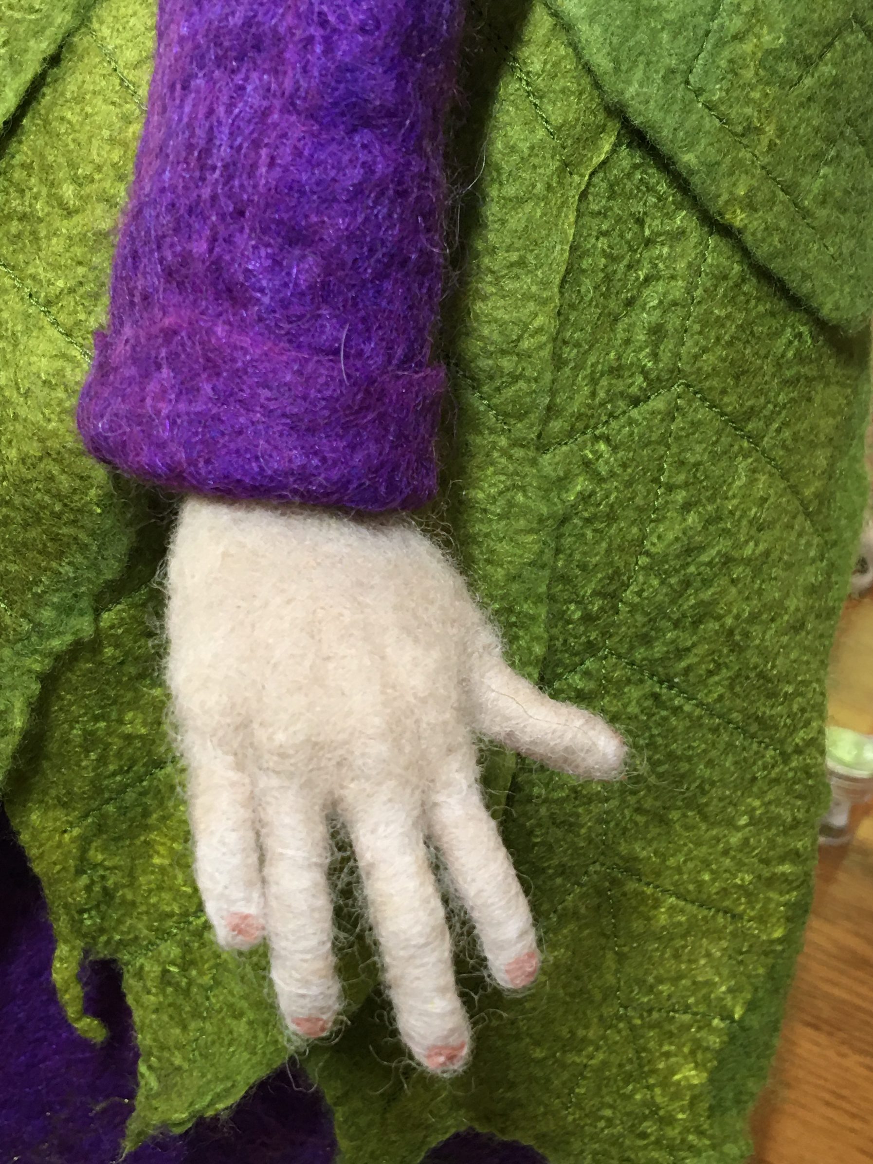 3rd new skill: LEARNING TO MAKE HUMAN HANDS with thin wire and wrapped wool. I’d made innumerable animal paws, hooves and claws, but never human hands – with their different length fingers, thumb and knuckles. Hands are quite tricky! Proportion was important again, to size the hands correctly with the body. So multiple hand sets made over more days of exploration.