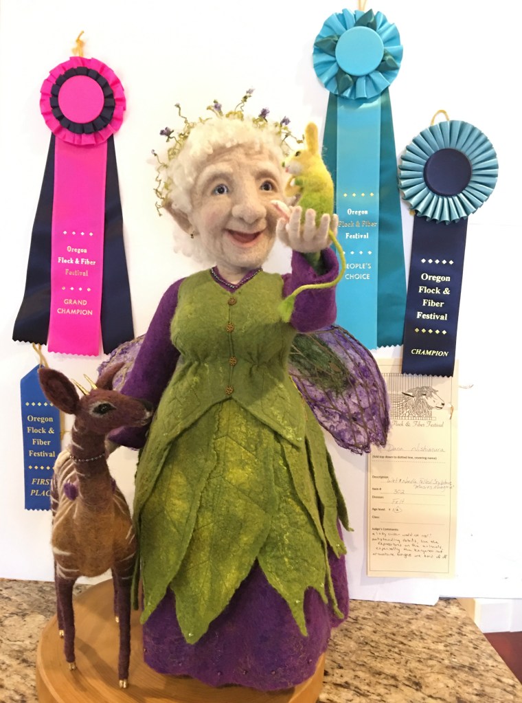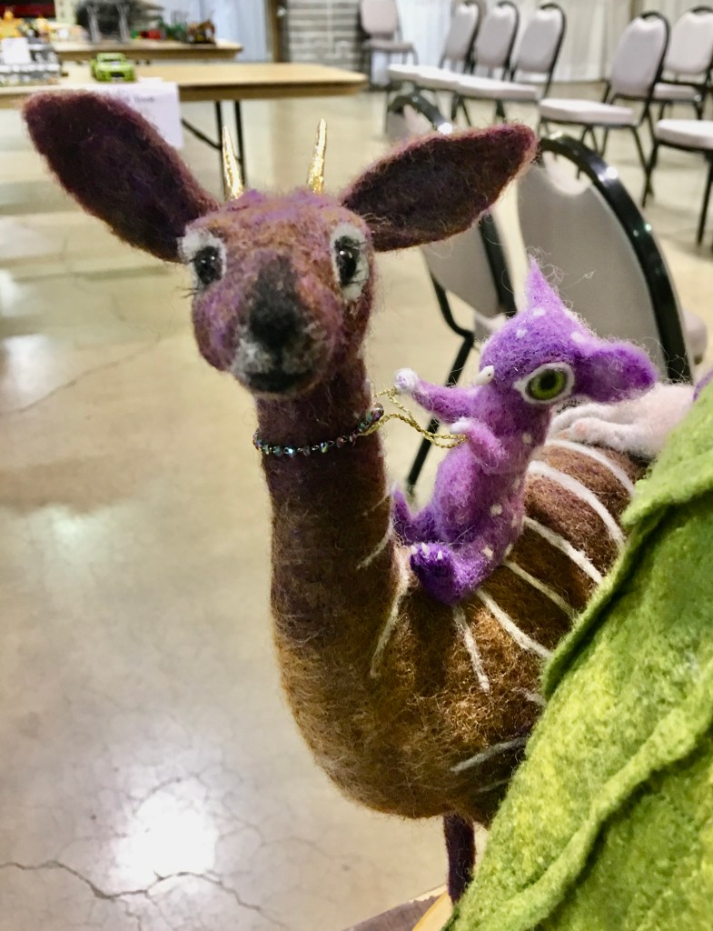 “Maisie’s Menagerie” went to 2023 Oregon State Fair in August, and – since I was present as a volunteer demonstrator for the craft of needle felting, I was able to have many lovely conversations about Maisie with fair visitors. Some people had never seen needle felting in action, and were curious: how is the wool held together by using those barbed needles and what could be built this way?