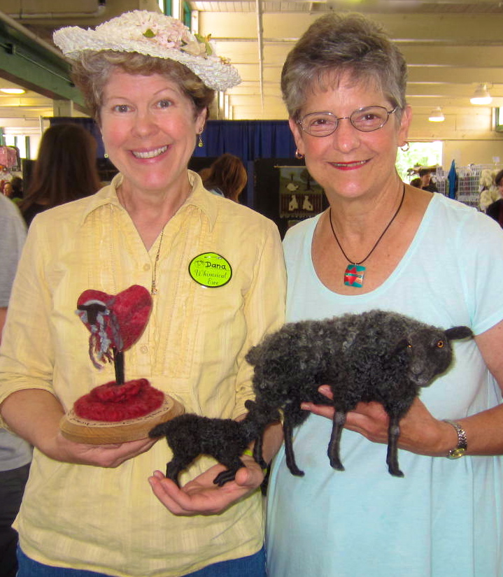 Black Sheep Gathering, 2013 Fine Arts Contest: People’s Choice Award, given for Best Overall Entry. Also, a 1st place ribbon (I entered the sheep as combined technique, wet-felting + needle felting). Here my Gotland Ewe & Lamb sculpture is being held by Mary, who won the Black Sheep Cup for her beautifully knit sweater, and ended up purchasing the Gotland sculpture. How satisfying to know my sheep have gone to live with this talented lady!
